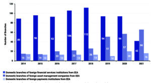 The number of domestic EEA branches of foreign institutions has decreased compared to the year 2020. This is a consequence of the Brexit and (statistically) the introduction of the category of securities institutions.
